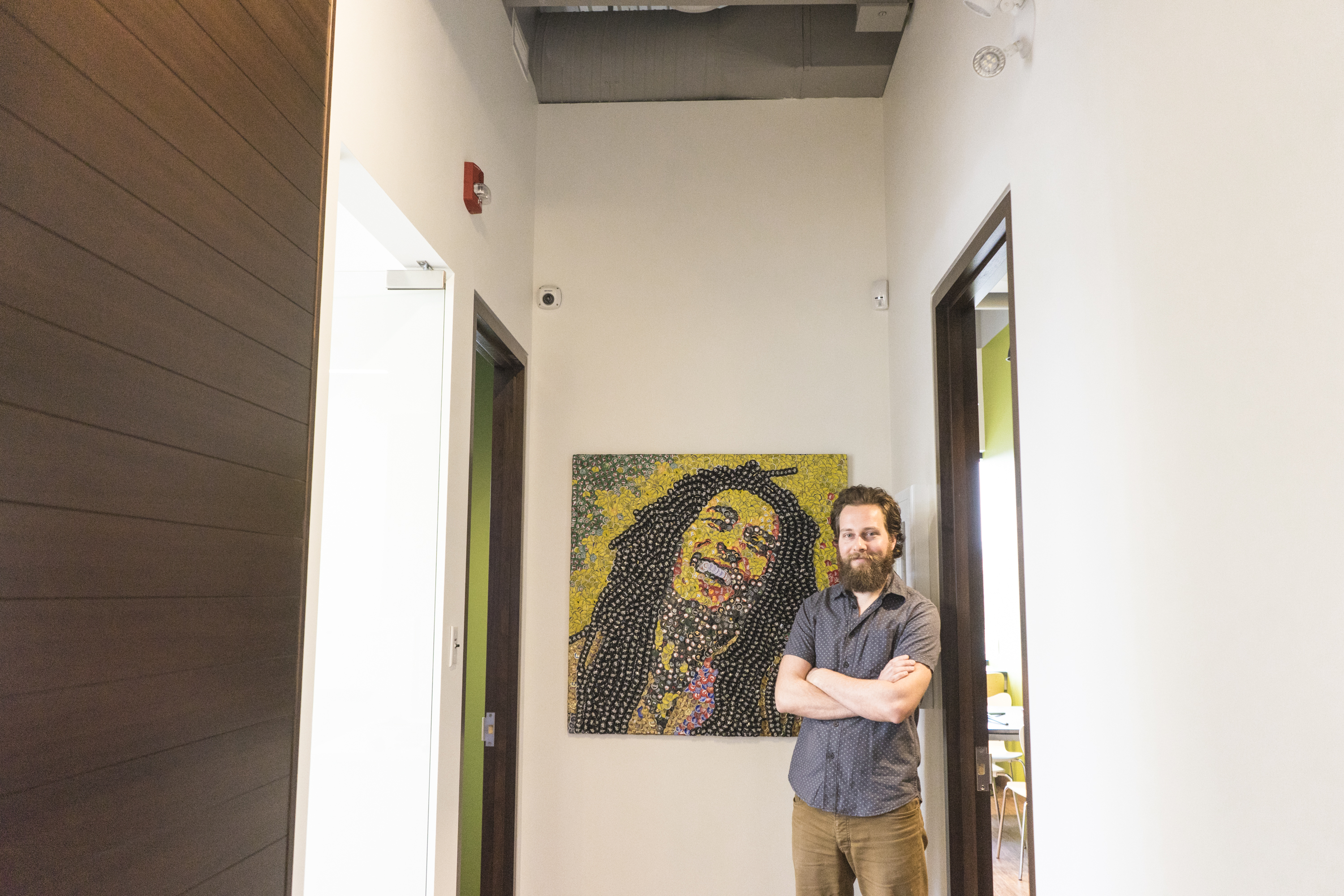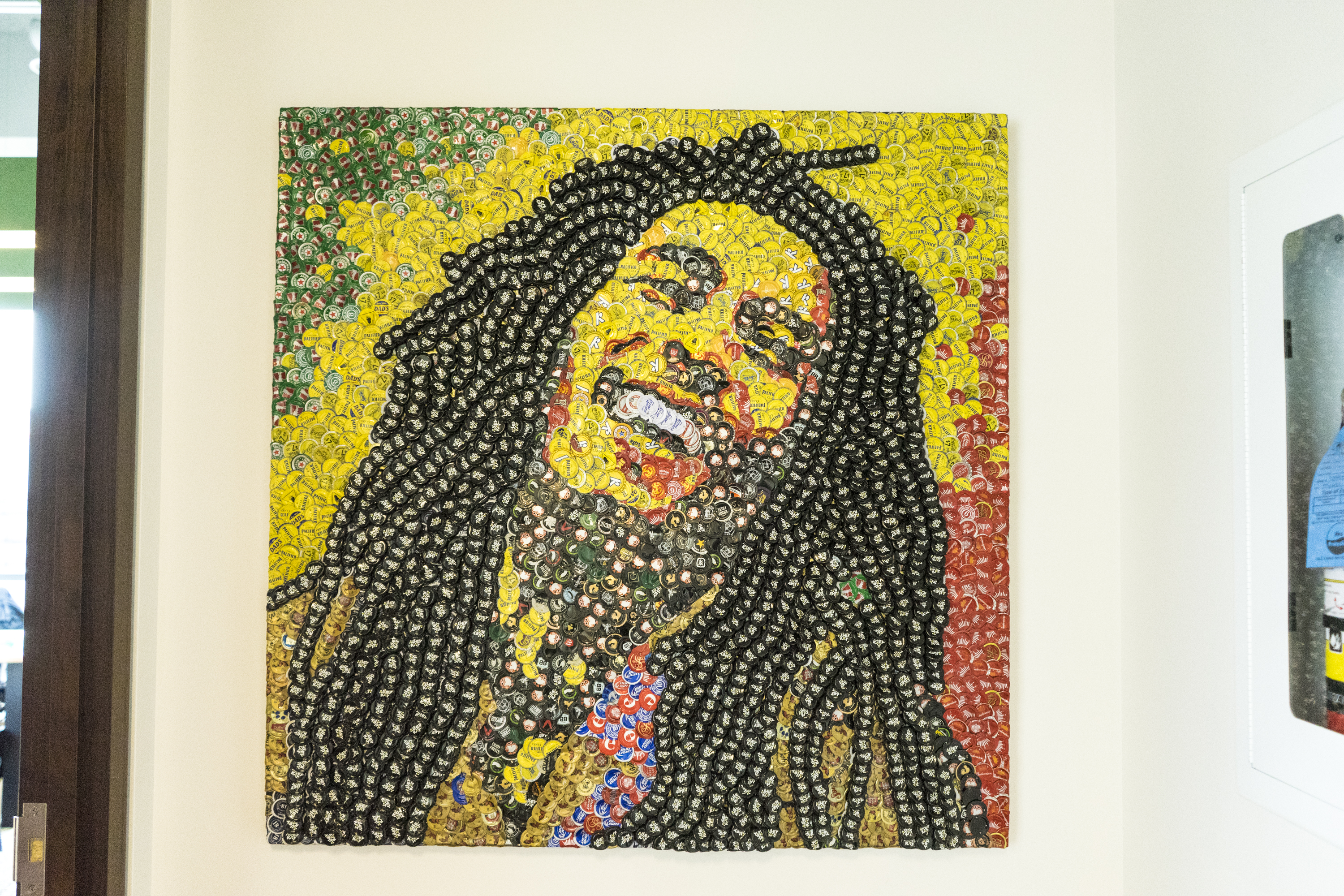 I had a part time job bartending throughout my music career and I noticed how many bottle caps and corks were being thrown out. To me, these were colourful and unique pixels of art. So I started saving them, not exactly sure how I would use them, but I knew it had to be in mosaic form. I started a long trial and error process of figuring out whether or not to flatten the caps, how to fasten them, and what to fasten them to. This took me a few years to get my technique down in an efficient manner, but I've been doing this artwork since 2014 and I feel like I have really found my style.